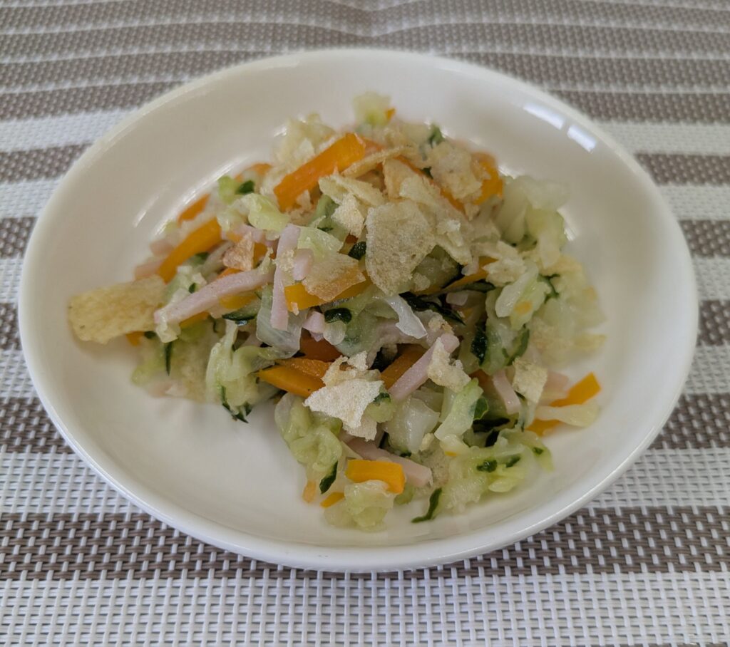 - 最後に砕いたポテトチップスを混ぜ、盛り付ける。出来上がり!