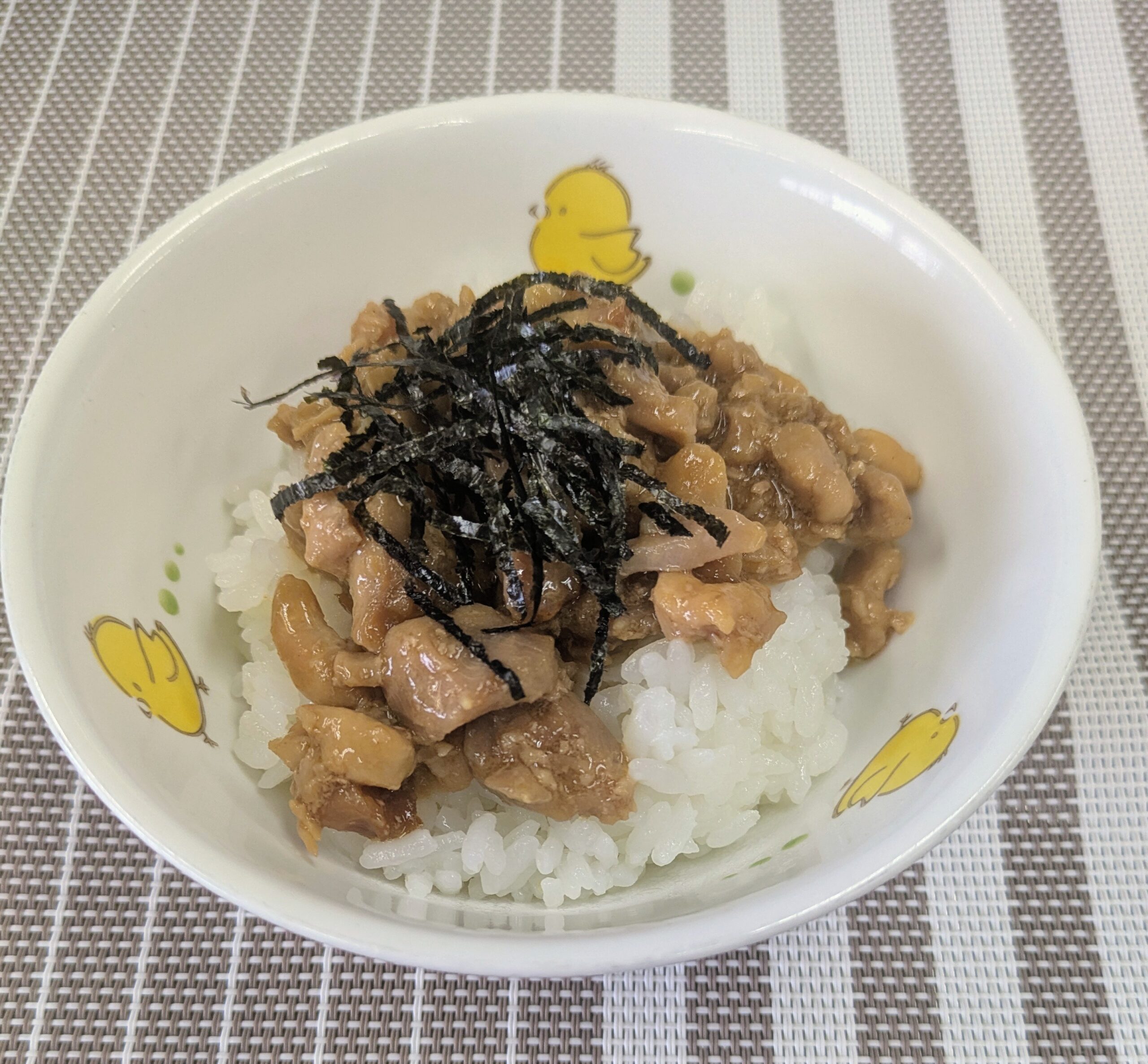 - ※ もも肉を使うことで柔らかく、オーブンで焼き目をつける事で香ばしさもアップする。また、タレにとろみをつける事で鶏肉とも絡みやすく、食べやすい。刻みのりの他に、茹でて刻んだほうれん草をのせてお肉と混ぜながら食べるとおいしいですよ!