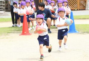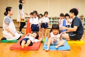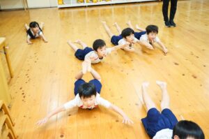 身体を動かすことを楽しいと思えるような取り組みをおこなっています。 ≪令和7年度 ねらい≫ 〇コントロール・バランス・リズム感・体幹を養う 〇身体を動かす楽しさを味わい、自身につなげることで意欲的に取り組む姿勢を身につける