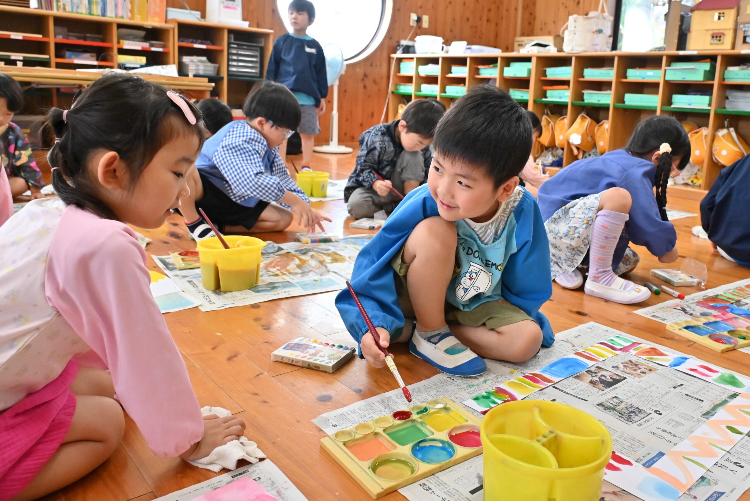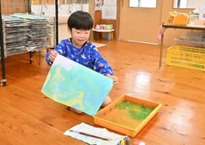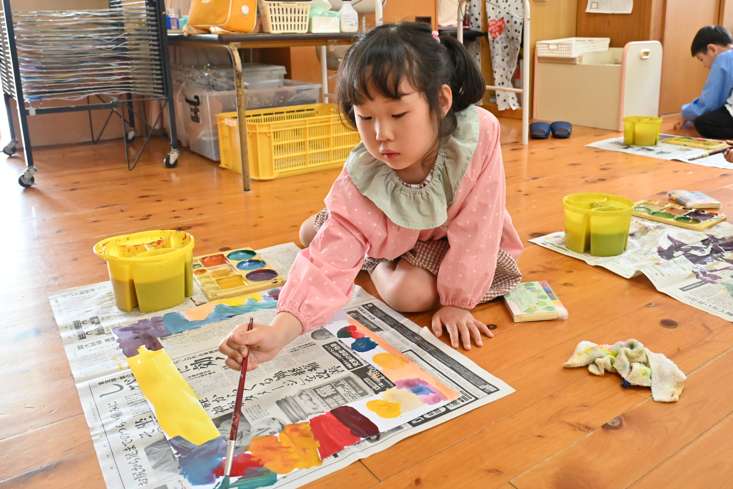はさみやのり等の使い方を知り、製作活動を通して、子ども達の想像力を育む活動をおこなっています。 ≪令和7年度 ねらい≫ 〇様々な技法を使った絵の具遊びを通して、感触・色・混ざり合いに興味を示し、 想像する楽しさや試してみようとする探究心を育む 〇自然に触れた製作を行い、季節を感じた作品や遊びを楽しむ 〇共同製作を行い、友達と一緒に作る楽しさを味わう
