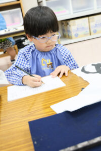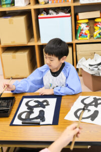 月に1~2回、園内で書道教室をおこなっています。対象は年長児クラスです。 講師の先生にご指導いただき、姿勢や正しい筆や鉛筆の持ち方などから教えていただきます。教室を重ねるたびに、集中力も養われ、入学に向けた準備ができます。